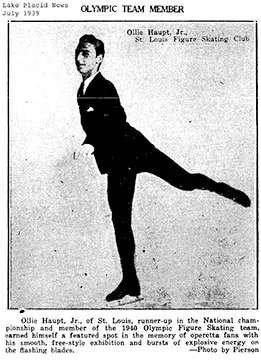 Ollie was an inspiration to many local skaters. Bob Brightfield, who at 86 is today “the oldest skater in St. Louis,” recalls that Ollie had a sweater with the five Olympic rings on it, and Bob says, “I was so impressed.” Bob remembers that Ollie could do two bunny hops and a waltz jump that nearly took him the length of the rink. When Ollie was drafted during World War II in 1942, eight of them went to Union Station to see him off. Ollie’s mother handed him a fifth of whiskey as he was getting onto the train.