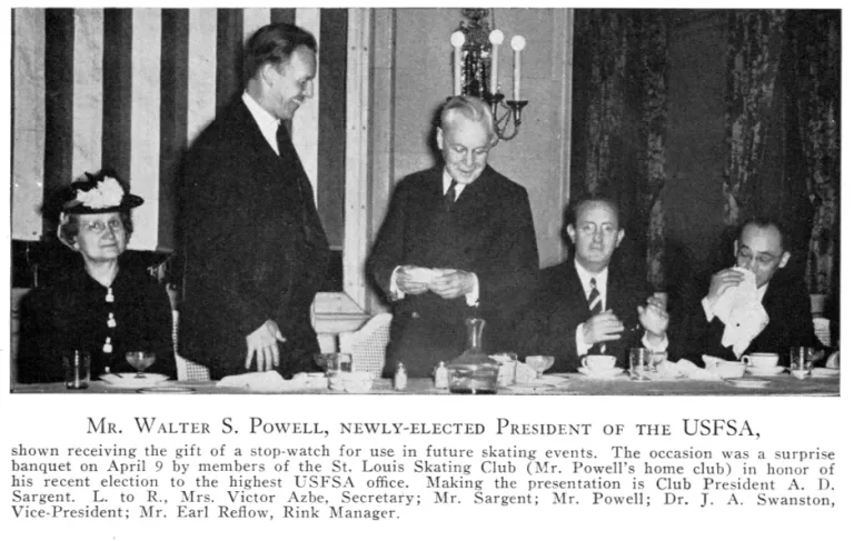 In addition to raising funds with carnivals, the more affluent members of the skating club funded the training of talented skaters. The pillar of the skating community was Walter Powell, Vice President of the Brown Shoe Company. He sponsored many skaters who didn’t know it. One of them was Red Knoll, who with his wife Sally Haas Knoll was a coach and mainstay in the St. Louis skating community up to the present. Red’s passing in 2005 was deeply felt by the skating community. Red thought he was receiving free lessons from his coaches until Powell’s wife told him after Powell’s death that his coaches had been paid by Powell. Sally Knoll said that no one called him “Walter” – it was “Mr. Powell.” “He seemed like he was very strict and proper but he was really a pussycat.” Helen Nightingale recalls him as “a quiet, nice man who never said a cross word.” Marge Brightfield joked that although he was a judge, “We would do a dance and he didn’t know the steps – how he judged I don’t know. It was political back then.”