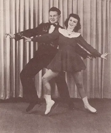 Earl Reflow’s two daughters, Elizabeth and Shirley, who was then nine, performed in the 1936 Carnival along with Sonja. A USFSA rule excluding rink managers and their families from skating clubs made it impossible to be the daughter of a rink manager and compete, but Shirley became known as an outstanding amateur show performer and was often a guest at club shows throughout the Midwest, which was unusual at that time. Some of her programs were considered risqué in their day, such as “A Persian Fantasy” in the St. Louis Skating Club’s 1944 Victory Ice Revue, which featured a costume with a bare midriff, but she remembers, “I was the most shy and scared – I never dated anyone.” In 1955 she left St. Louis for Chicago when her husband was transferred. Her married name is Shirley Sherman, and today she is a national-level judge in singles/pairs and dance who has judged eleven senior nationals since 1979. Her sister, Elizabeth Binder, still lives in St. Louis.